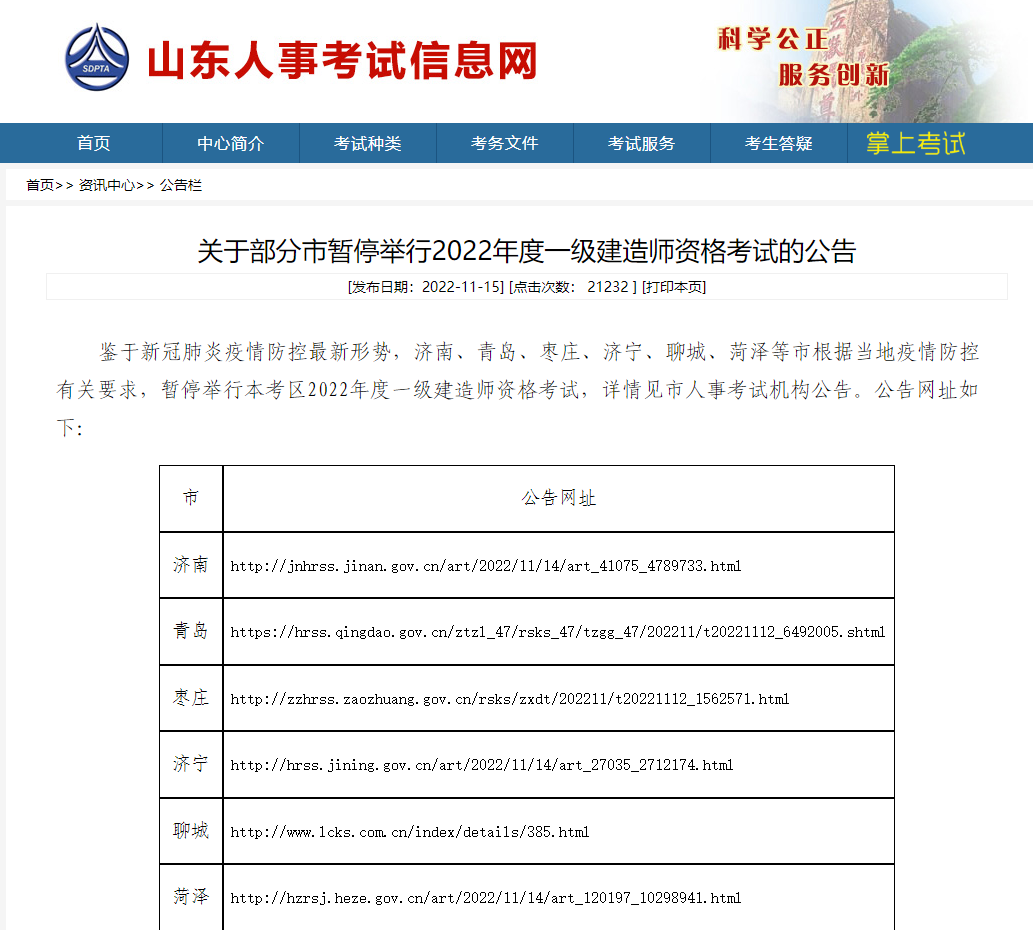 鉴于新冠肺炎疫情防控最新形势,济南、青岛、枣庄、济宁、聊城、菏泽等市根据当地疫情防控有关要求,暂停举行本考区2022年度一级建造师资格考试,详情见市人事考试机构公告。公告网址如下: