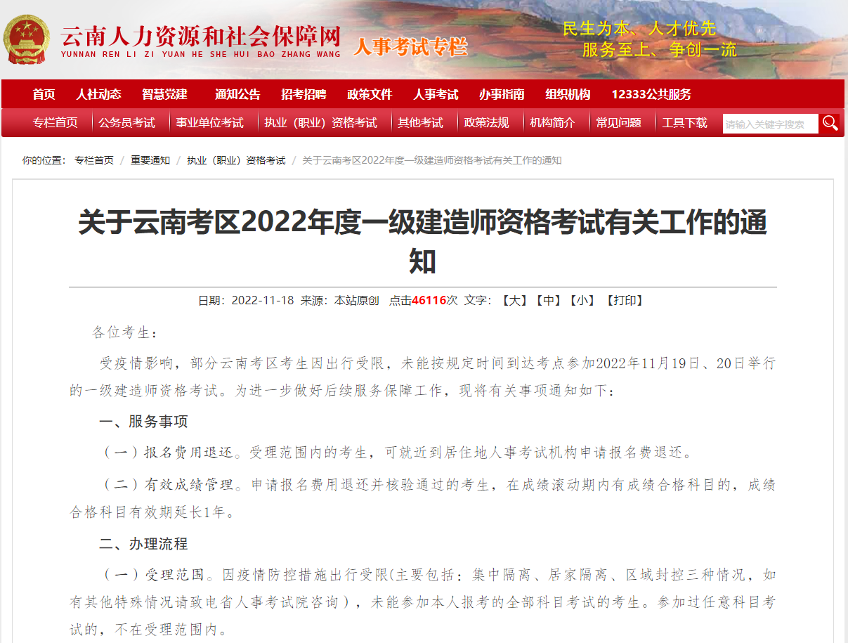 受疫情影响,部分云南考区考生因出行受限,未能按规定时间到达考点参加2022年11月19日、20日举行的一级建造师资格考试。为进一步做好后续服务保障工作,现将有关事项通知如下: