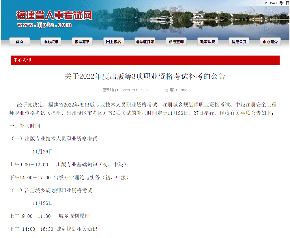 经研究决定,福建省2022年度出版专业技术人员职业资格考试、注册城乡规划师职业资格考试、中级注册安全工程师职业资格考试(福州、泉州设区市考区)等3项考试的补考时间定于11月26日、27日举行。现将有关事项公告如下: