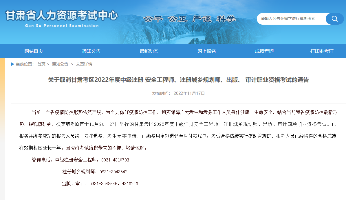 问:为什么取消举行甘肃考区2022年度中级注册安全工程师、注册城乡规划师、出版、审计职业资格考试?