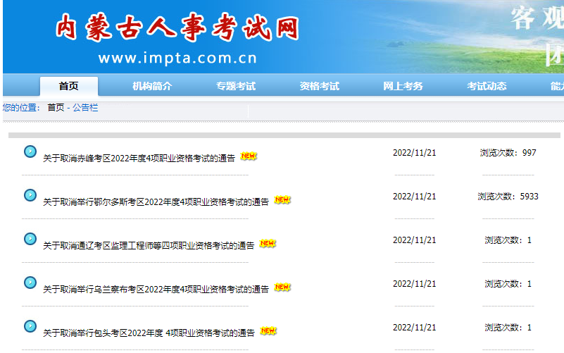 为全力做好疫情防控工作,切实保障广大考生身体健康和生命安全,结合内蒙古最新疫情防控形势,且暂无适宜场所作为考点,不具备实施考试条件。经综合研判决定取消原定于2022年11月26-27日举行的呼和浩特、包头、鄂尔多斯、赤峰、通辽、乌兰察布考区下列4项职业资格考试:
