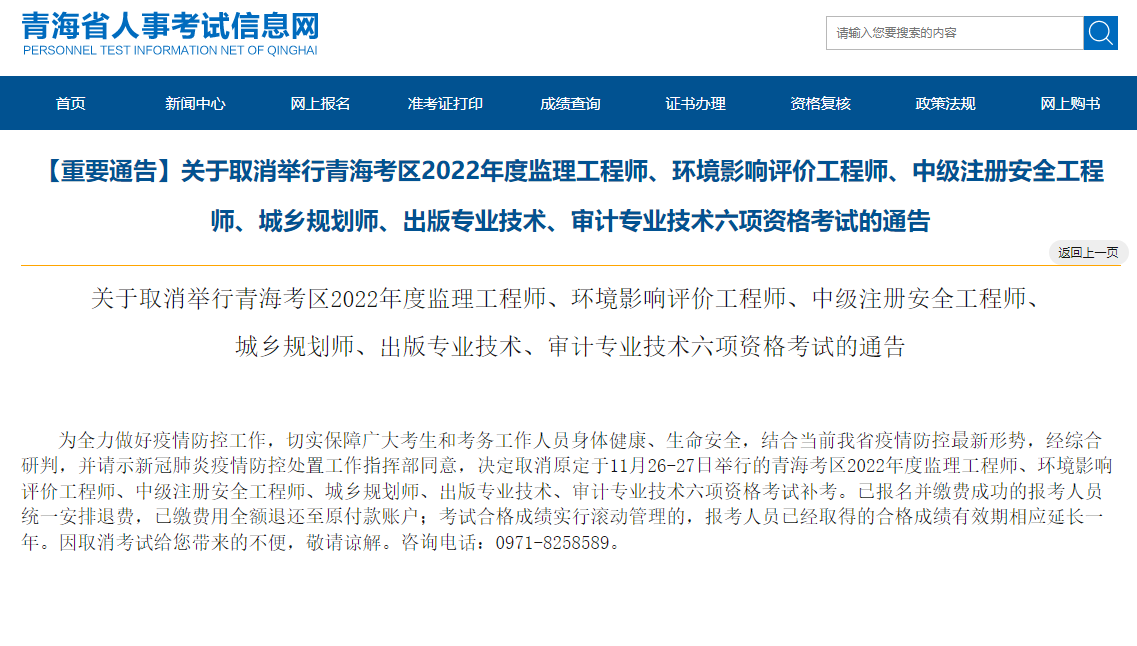为全力做好疫情防控工作,切实保障广大考生和考务工作人员身体健康、生命安全,结合当前我省疫情防控最新形势,经综合研判,并请示新冠肺炎疫情防控处置工作指挥部同意,决定取消原定于11月26-27日举行的青海考区2022年度监理工程师、环境影响评价工程师、中级注册安全工程师、城乡规划师、出版专业技术、审计专业技术六项资格考试补考。已报名并缴费成功的报考人员统一安排退费,已缴费用全额退还至原付款账户;考试合格成绩实行滚动管理的,报考人员已经取得的合格成绩有效期相应延长一年。因取消考试给您带来的不便,敬请谅解。咨询电话:0971-8258589。