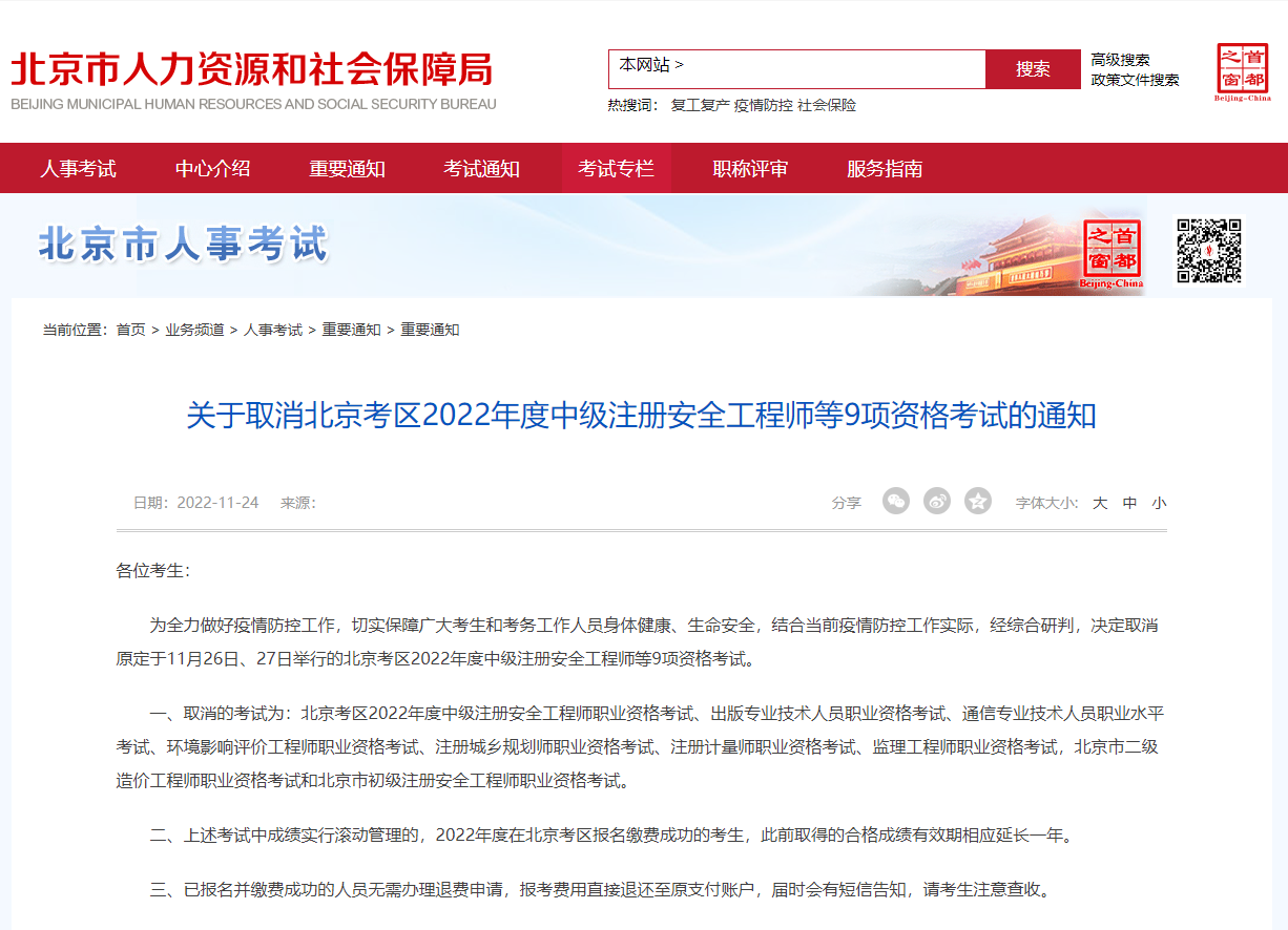 关于取消北京考区2022年度中级注册安全工程师