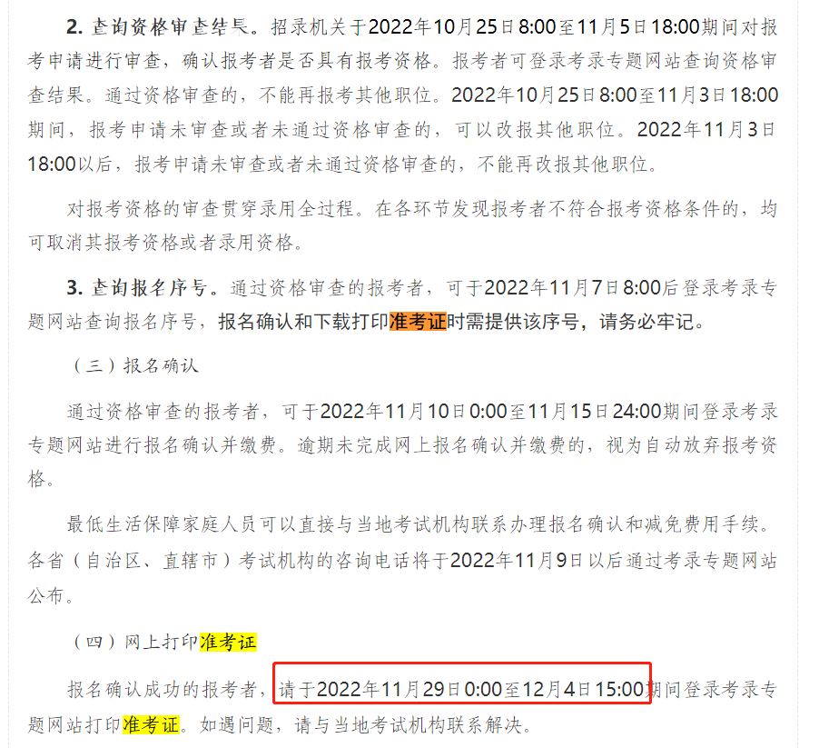 报名确认成功的报考者,请于2022年11月29日0:00至12月4日15:00期间登录考录专题网站打印准考证。如遇问题,请与当地考试机构联系解决。