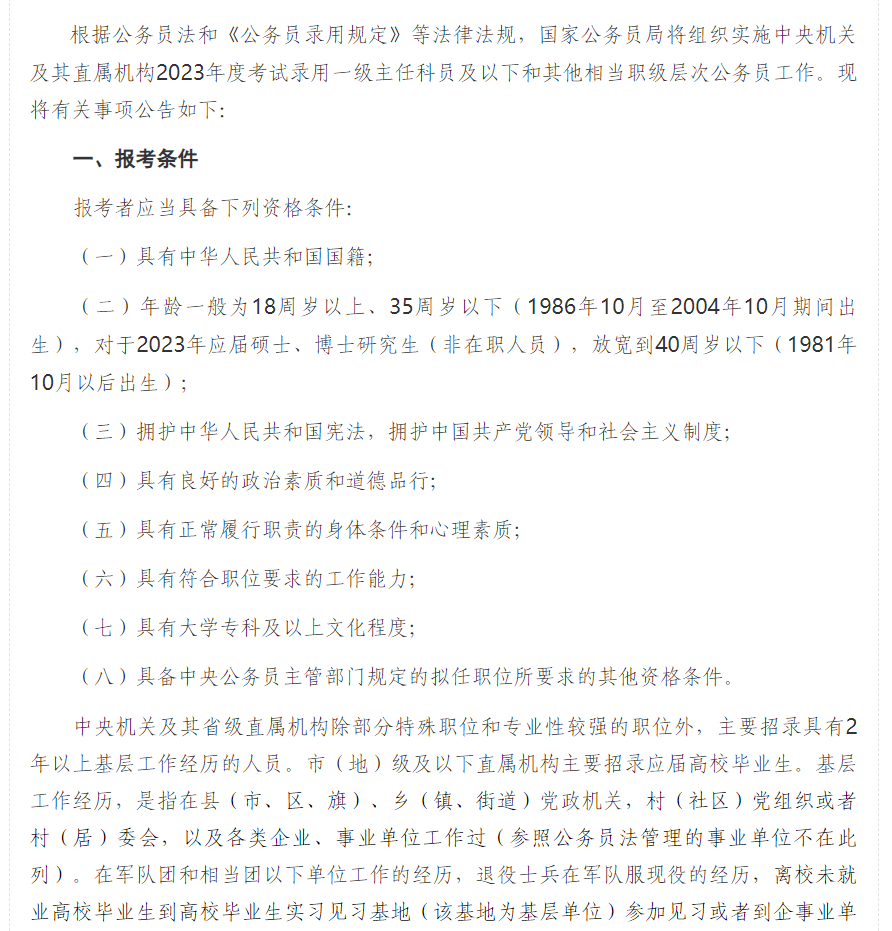 中央机关及其省级直属机构除部分特殊职位和专业性较强的职位外,主要招录具有2年以上基层工作经历的人员。市(地)级及以下直属机构主要招录应届高校毕业生。基层工作经历,是指在县(市、区、旗)、乡(镇、街道)党政机关,村(社区)党组织或者村(居)委会,以及各类企业、事业单位工作过(参照公务员法管理的事业单位不在此列)。在军队团和相当团以下单位工作的经历,退役士兵在军队服现役的经历,离校未就业高校毕业生到高校毕业生实习见习基地(该基地为基层单位)参加见习或者到企事业单位参与项目研究的经历,可视为基层工作经历。报考中央机关的,曾在市(地、州、盟)直属机关工作的经历,也可视为基层工作经历。直辖市区(县)机关工作经历视同为基层工作经历。基层工作经历计算截止时间为2022年10月。