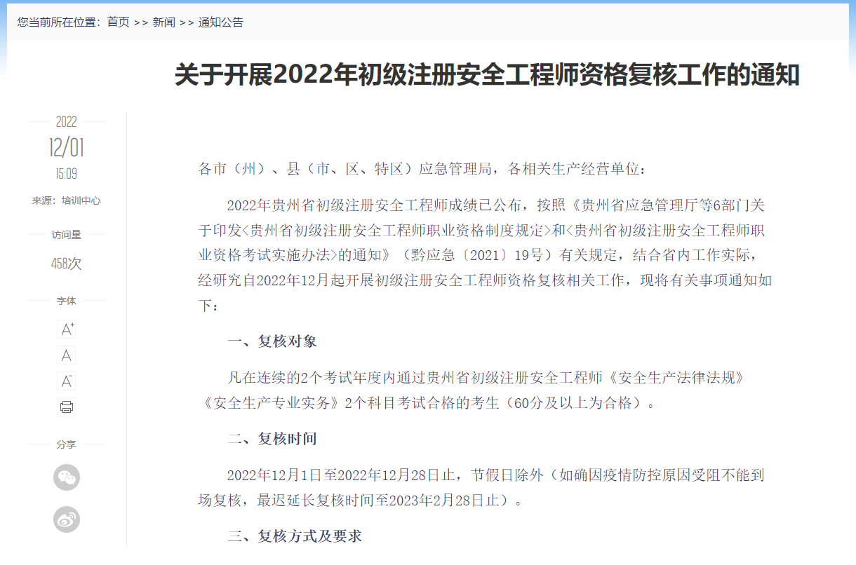 2022年贵州省初级注册安全工程师成绩已公布,按照《贵州省应急管理厅等6部门关于印发<贵州省初级注册安全工程师职业资格制度规定>和<贵州省初级注册安全工程师职业资格考试实施办法>的通知》(黔应急〔2021〕19号)有关规定,结合省内工作实际,经研究自2022年12月起开展初级注册安全工程师资格复核相关工作,现将有关事项通知如下: